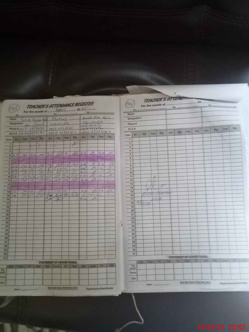 | CNIC | Full Name | Designation | R/C | Absence During Last Calender Month |