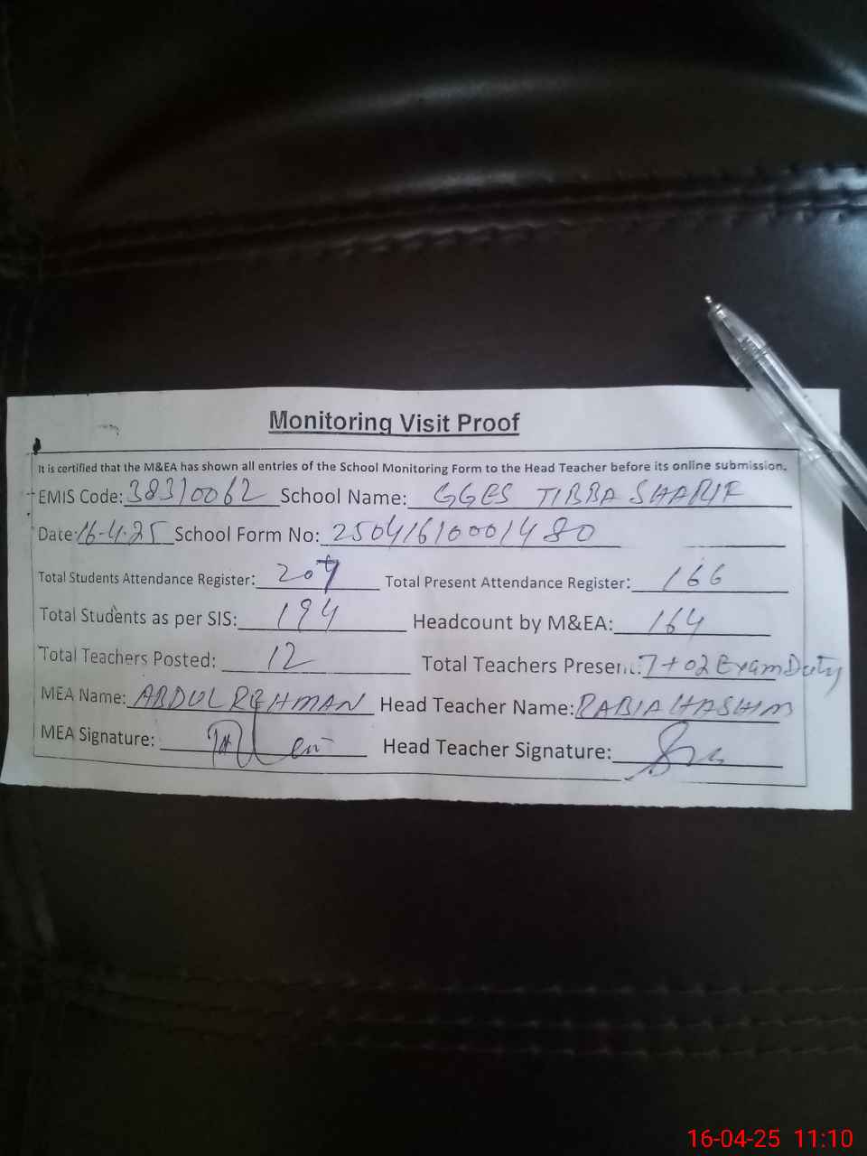 | Attendance Register | Head Teacher | MEA with School | Visit Proof |
