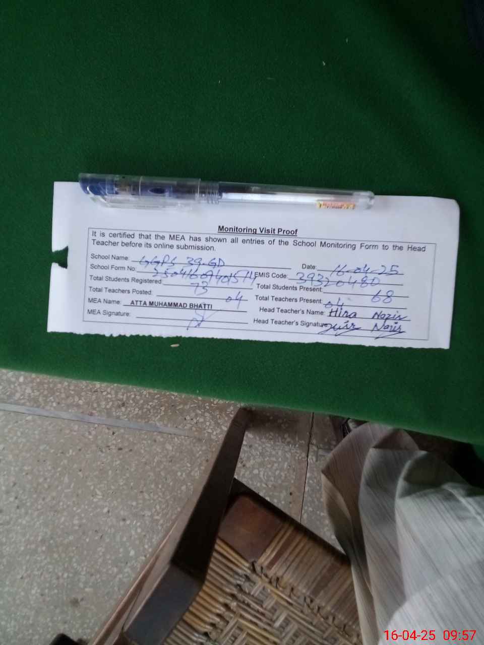| Attendance Register | Head Teacher | MEA with School | Visit Proof |