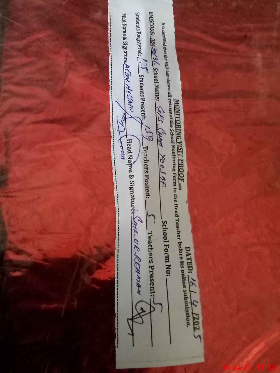 | Attendance Register | Head Teacher | MEA with School | Visit Proof |