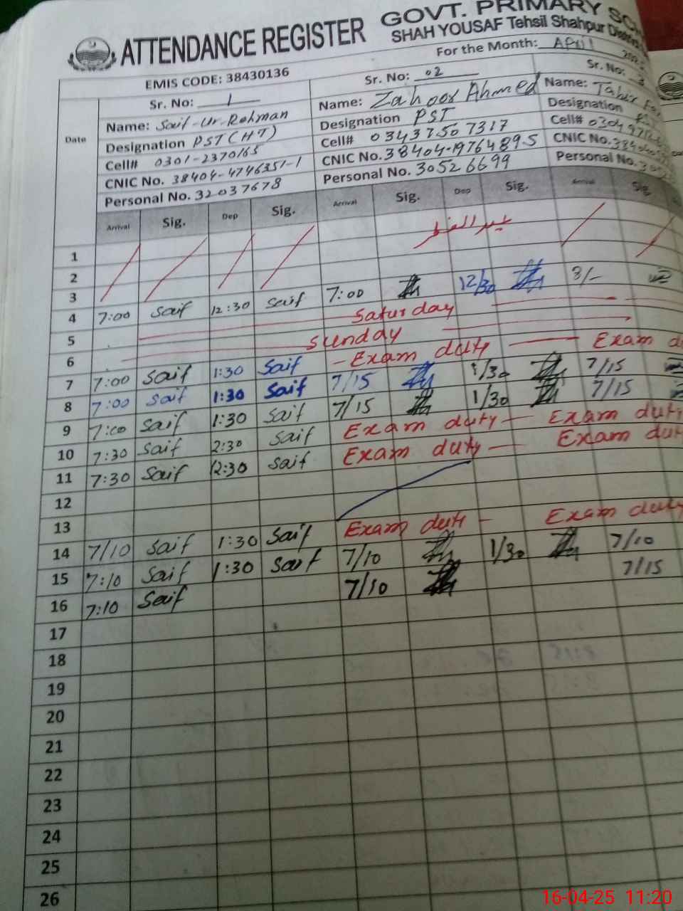 | Name: SA**** URRE**** Designation: (School Headmaster's/Headmistress's) PST Phone/Cell Number: 03**** |