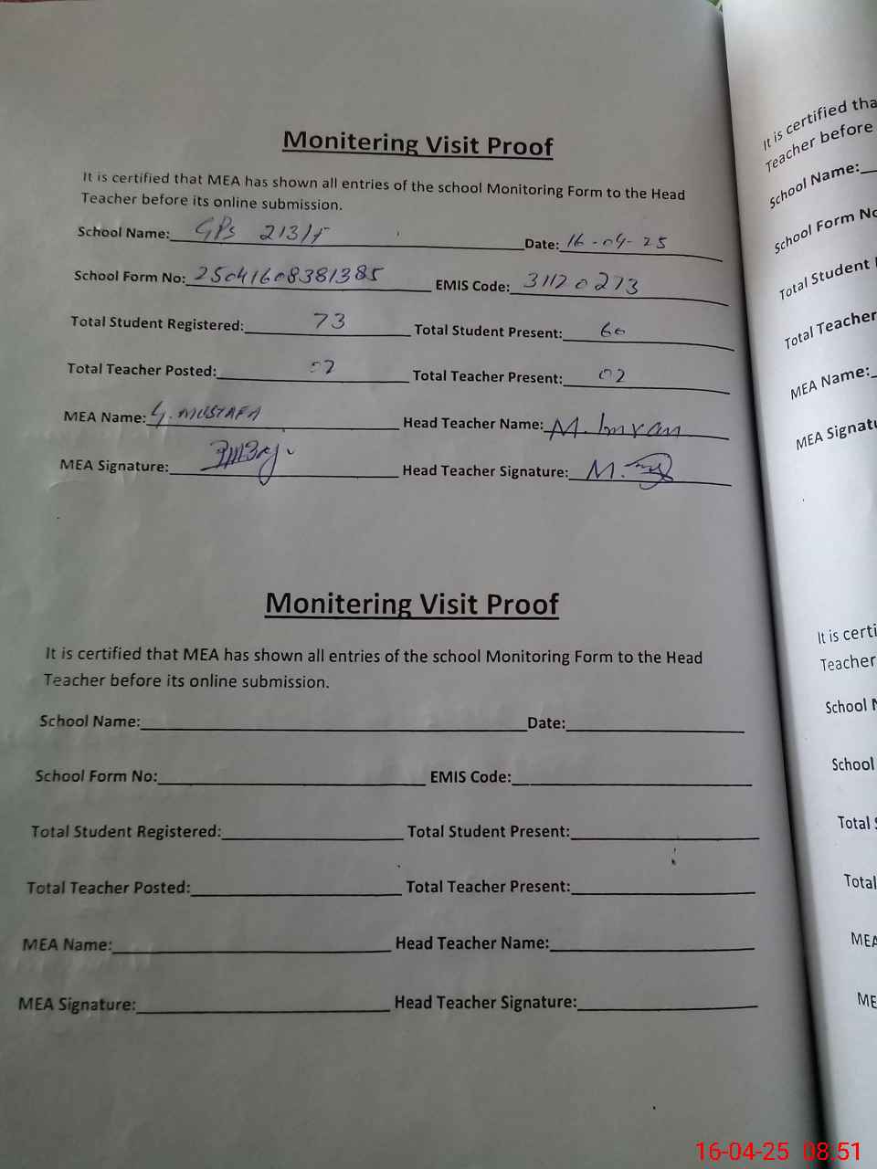 | Attendance Register | Head Teacher | MEA with School | Visit Proof |