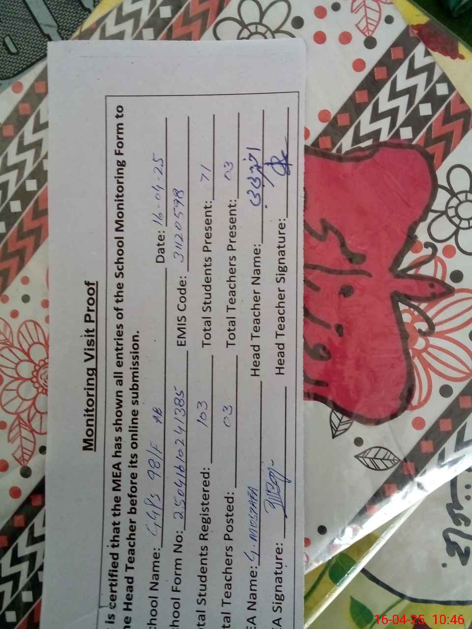 | Attendance Register | Head Teacher | MEA with School | Visit Proof |
