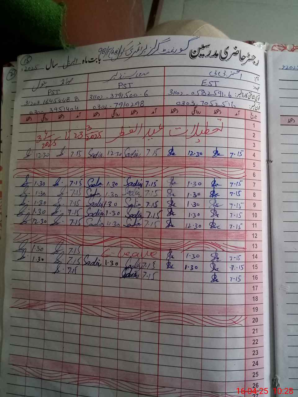 | CNIC | Full Name | Designation | R/C | Absence During Last Calender Month |