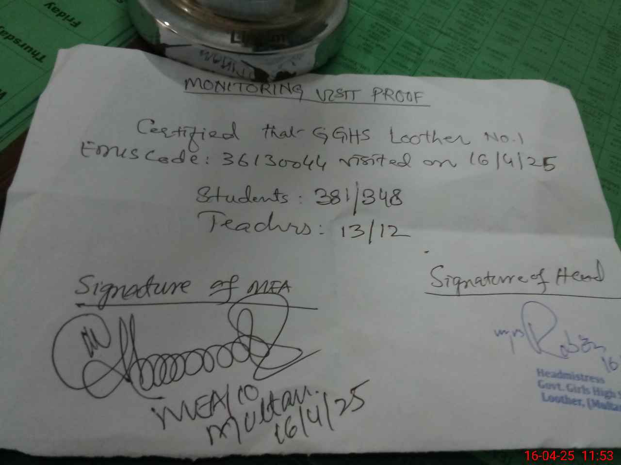 | Attendance Register | Head Teacher | MEA with School | Visit Proof |