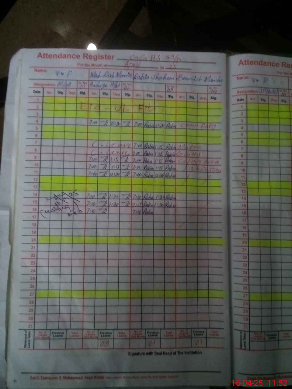 | CNIC | Full Name | Designation | R/C | Absence During Last Calender Month |