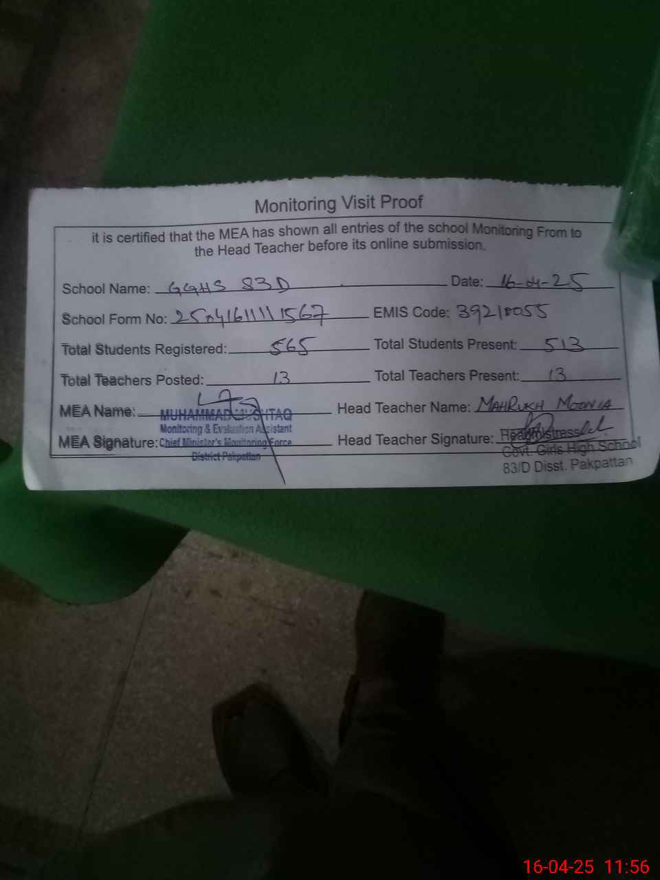 | Attendance Register | Head Teacher | MEA with School | Visit Proof |