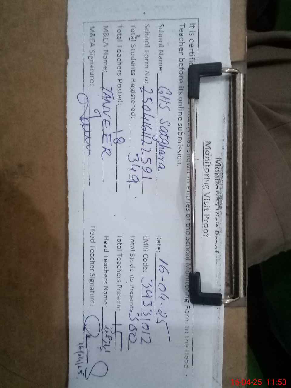 | Attendance Register | Head Teacher | MEA with School | Visit Proof |