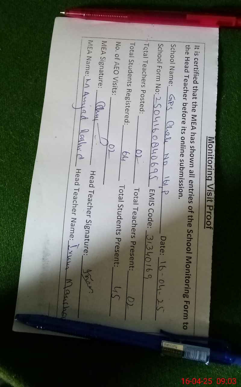 | Attendance Register | Head Teacher | MEA with School | Visit Proof |