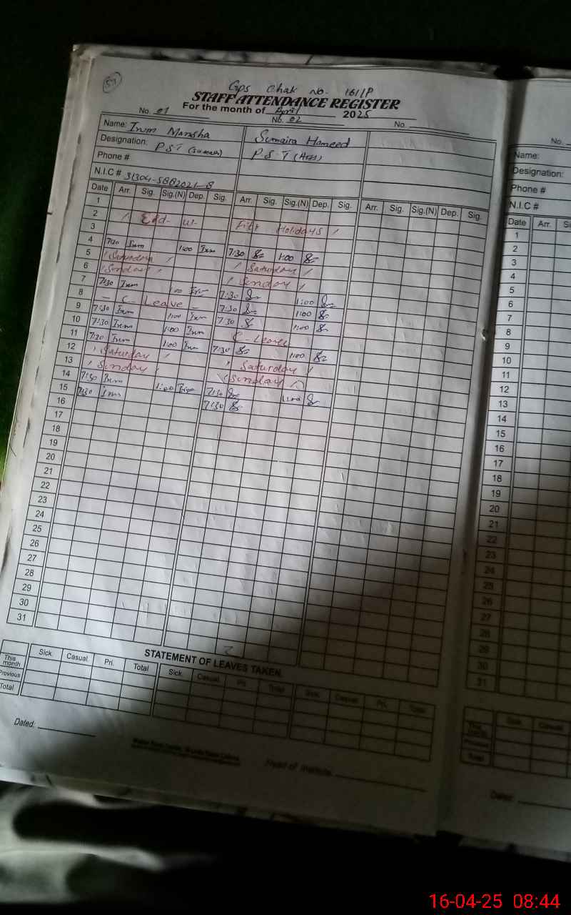 | Name: Ir**** Ma**** Designation: (School Headmaster's/Headmistress's) PST Phone/Cell Number: 03**** |