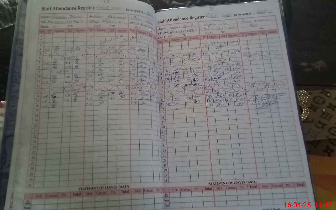 | CNIC | Full Name | Designation | R/C | Absence During Last Calender Month |