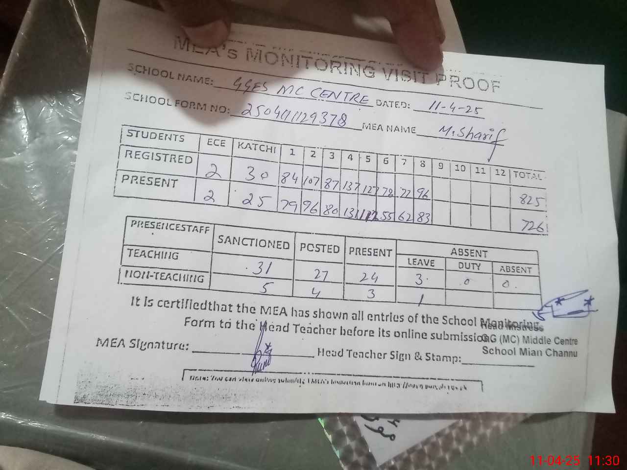 | Attendance Register | Head Teacher | MEA with School | Visit Proof |