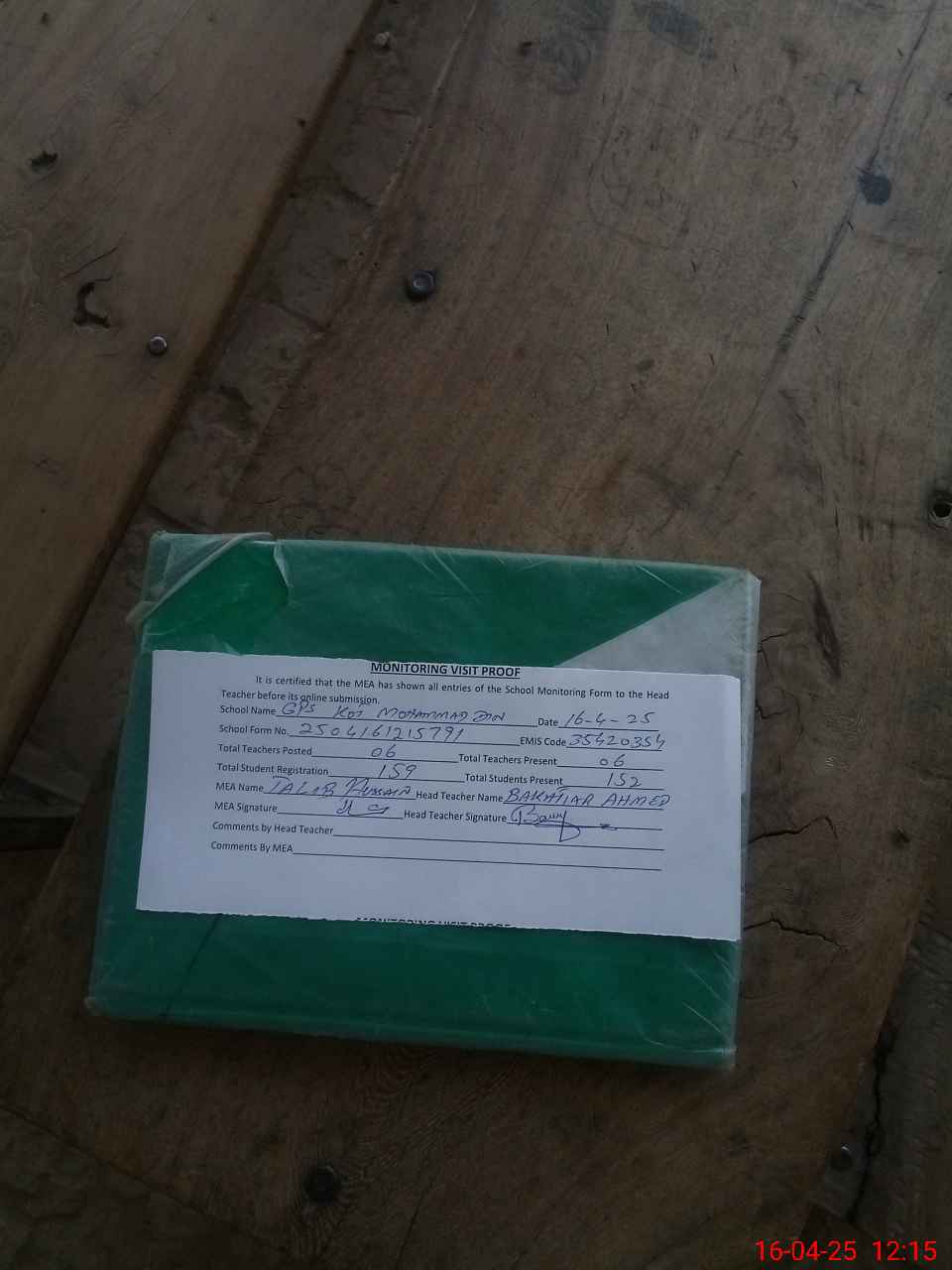 | Attendance Register | Head Teacher | MEA with School | Visit Proof |