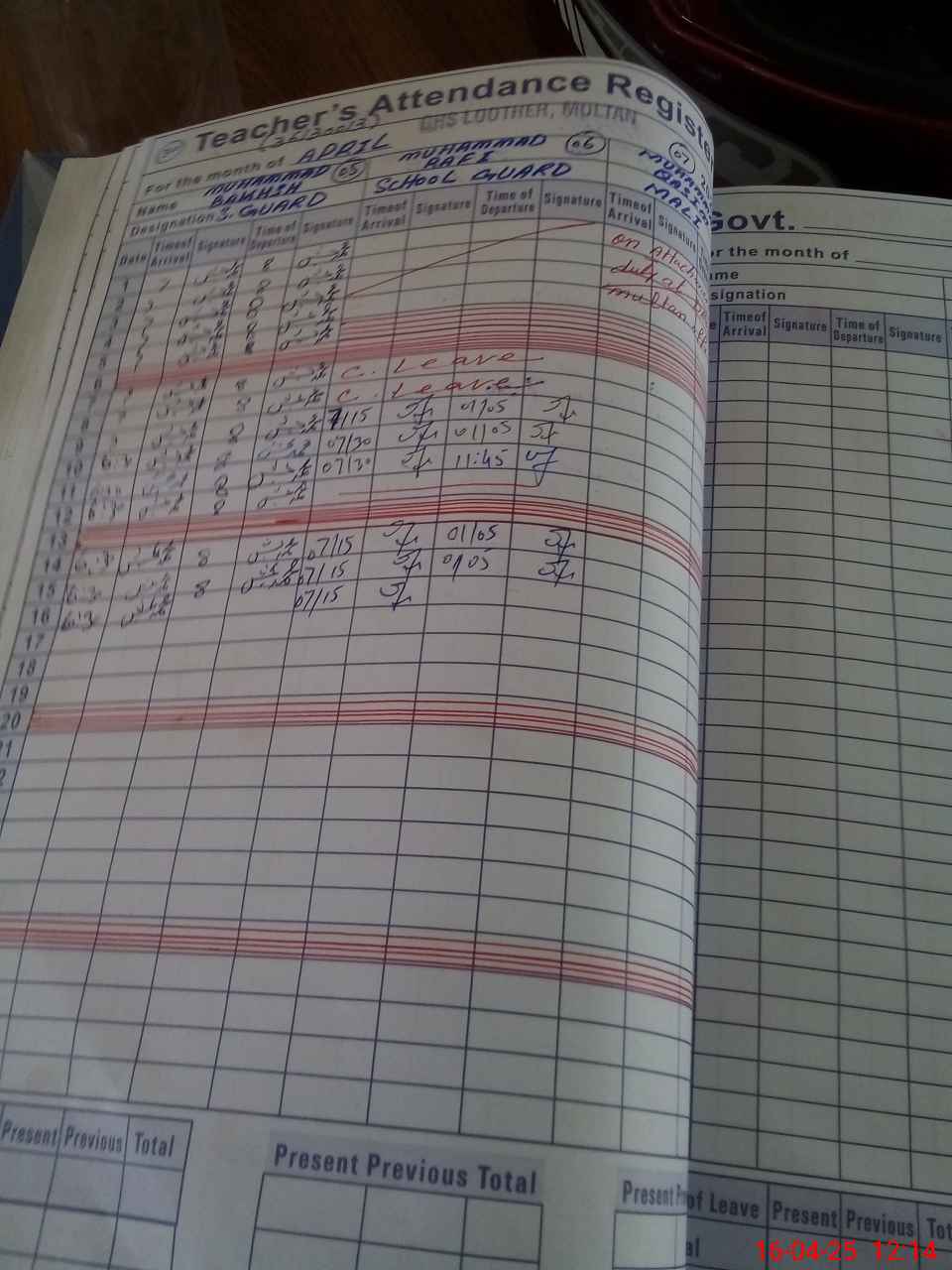 | CNIC | Full Name | Designation | R/C | Absence During Last Calender Month |