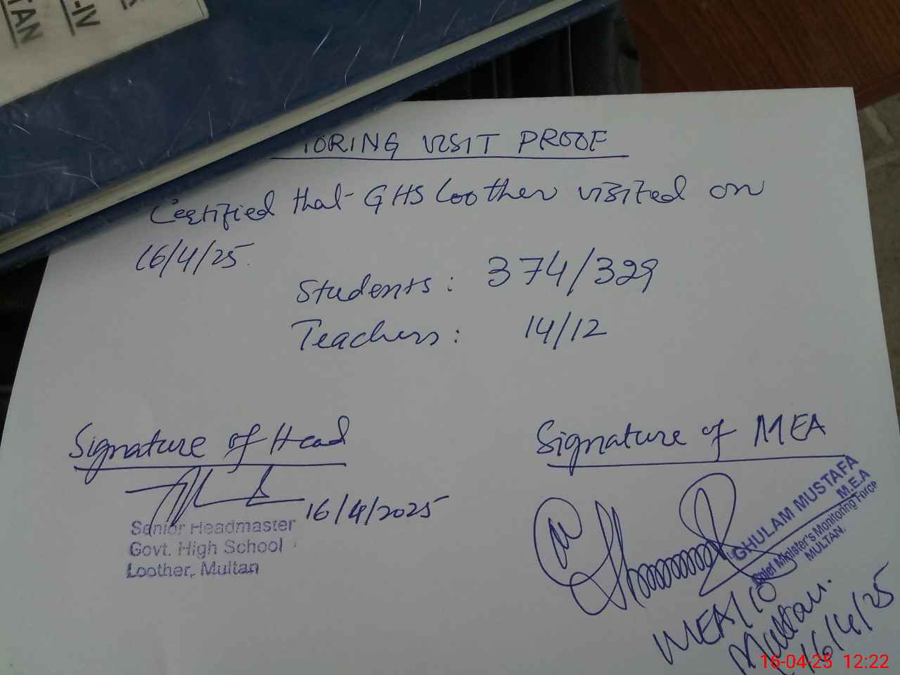 | Attendance Register | Head Teacher | MEA with School | Visit Proof |
