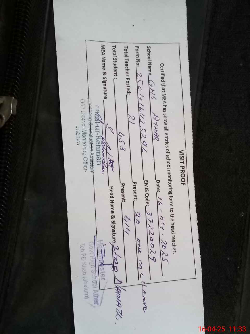 | Attendance Register | Head Teacher | MEA with School | Visit Proof |