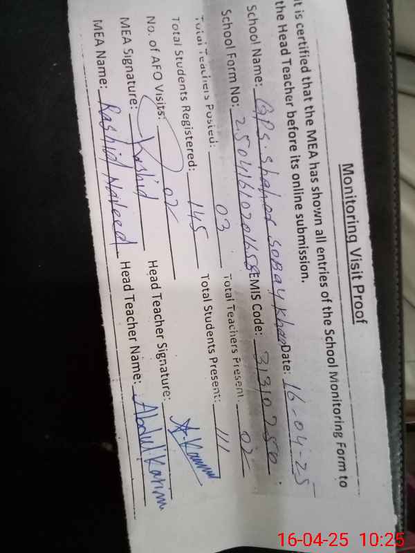 | EMIS Code: 31310250 | Name of School: GPS SHAHER SOBAY KHAN | |||