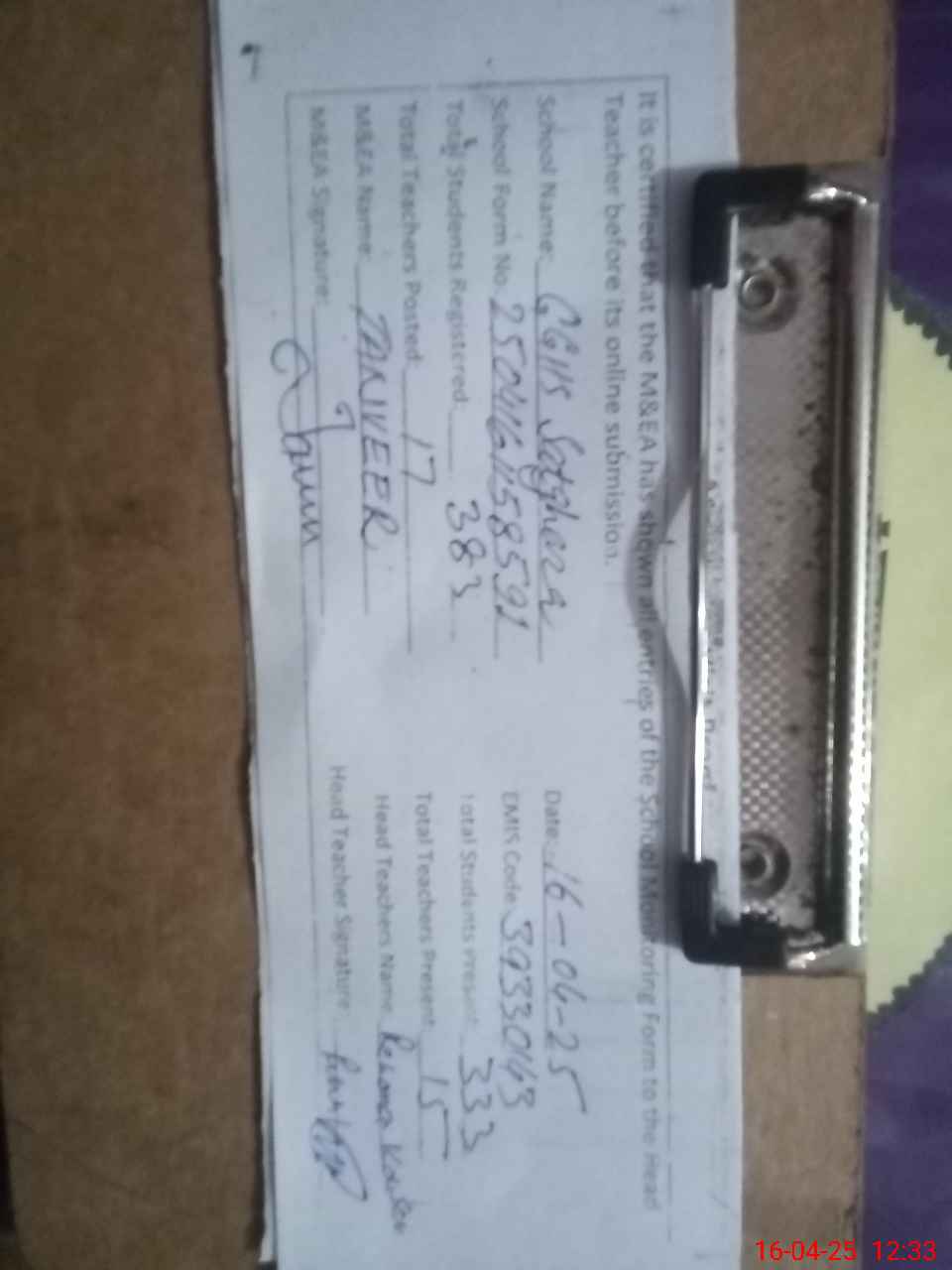 | Attendance Register | Head Teacher | MEA with School | Visit Proof |
