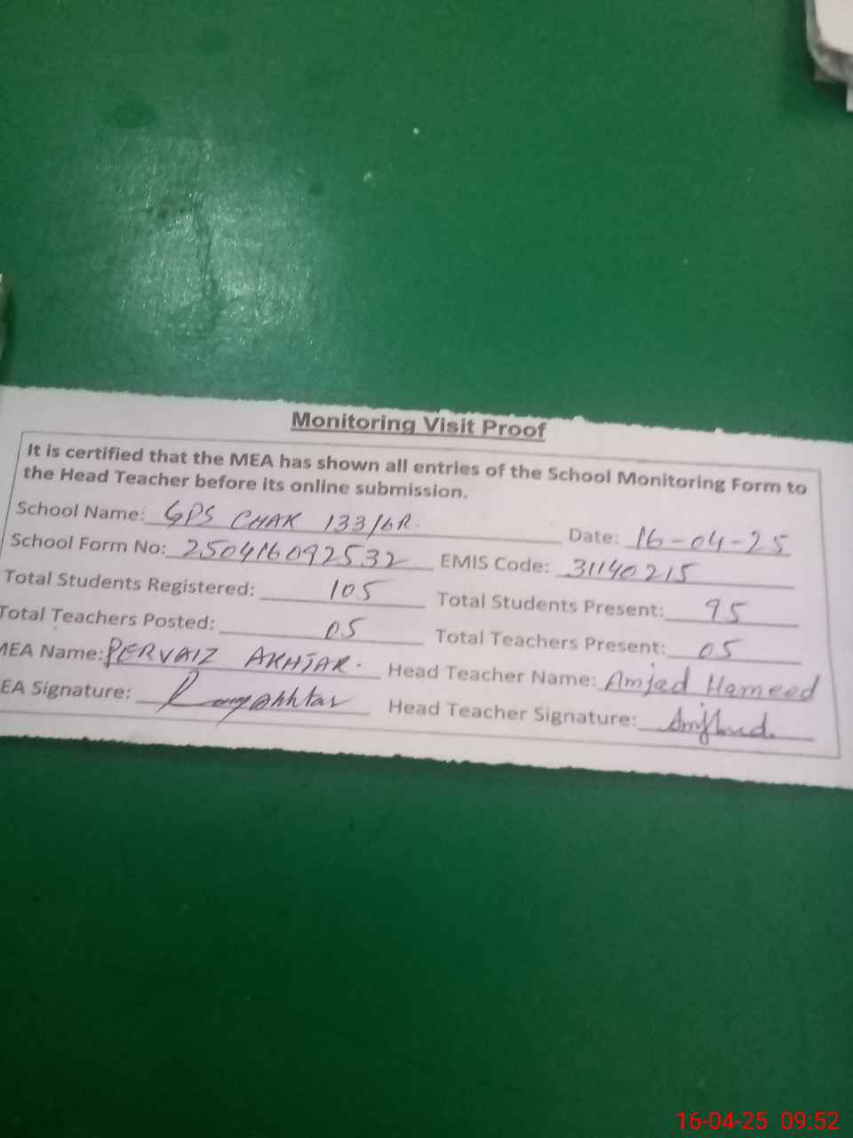 | Attendance Register | Head Teacher | MEA with School | Visit Proof |