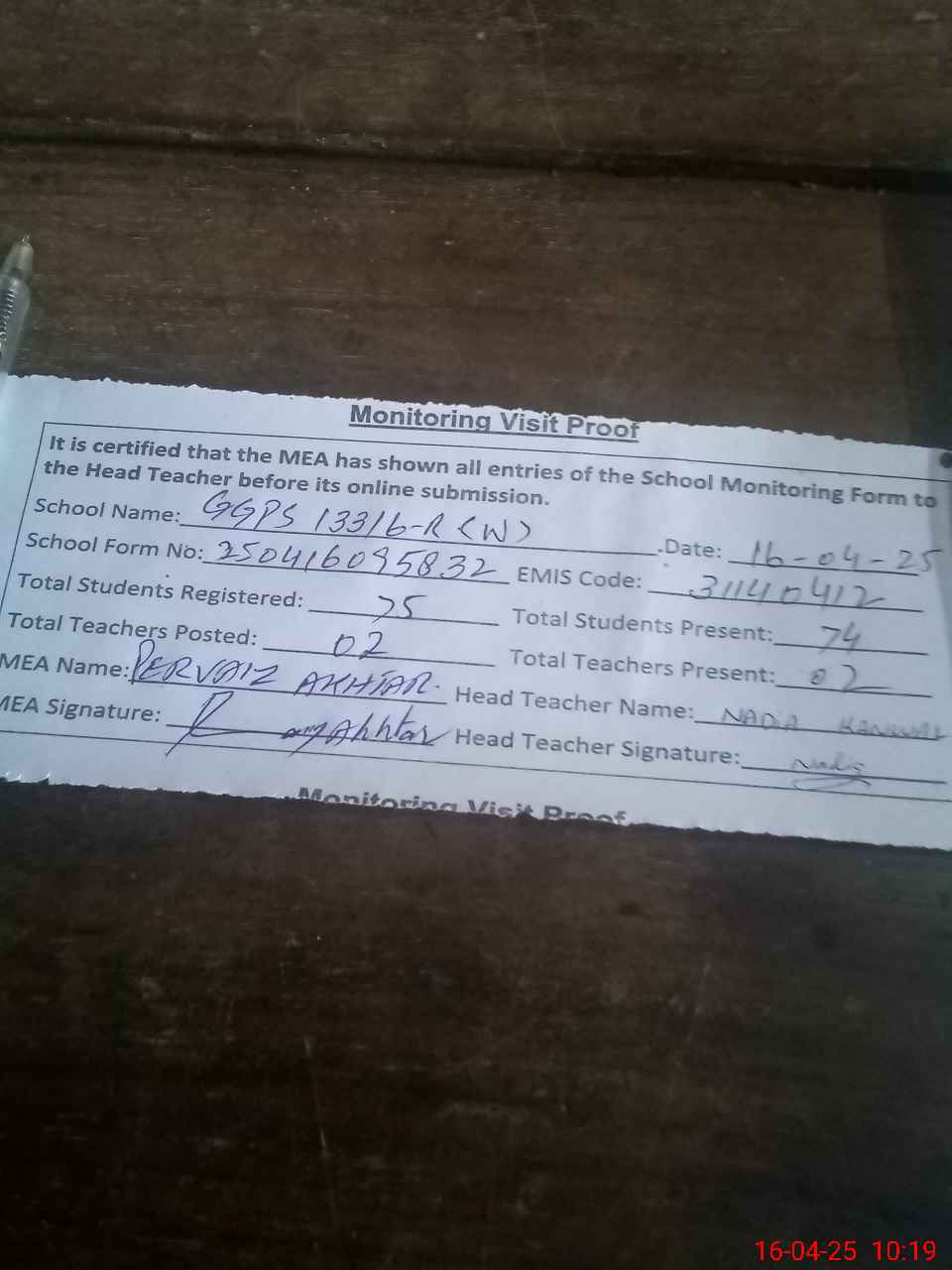 | Attendance Register | Head Teacher | MEA with School | Visit Proof |