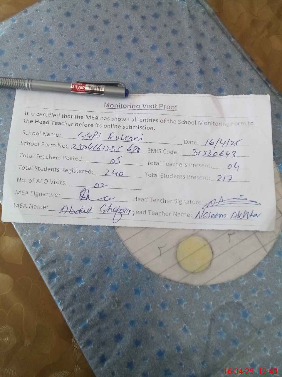 | Attendance Register | Head Teacher | MEA with School | Visit Proof |