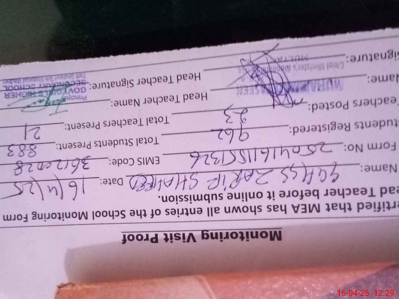 | Attendance Register | Head Teacher | MEA with School | Visit Proof |