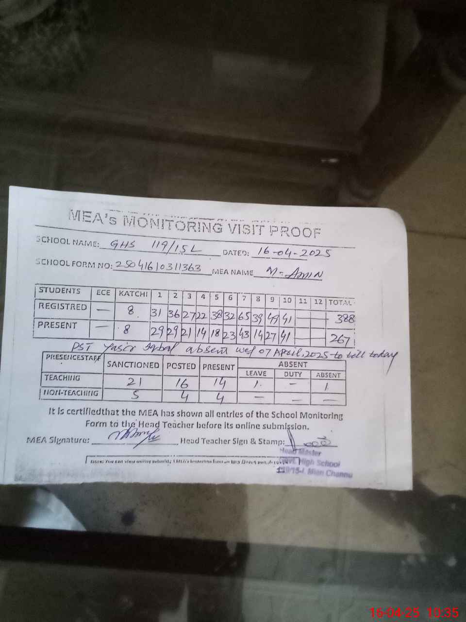 | EMIS Code: 36430009 | Name of School: GHS 119/15-L, MIAN CHANNU | |||
