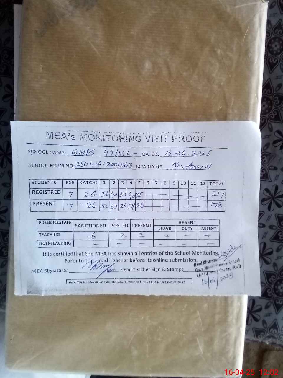 | EMIS Code: 36430282 | Name of School: GMPS 49/15-L, MIAN CHANNU | |||