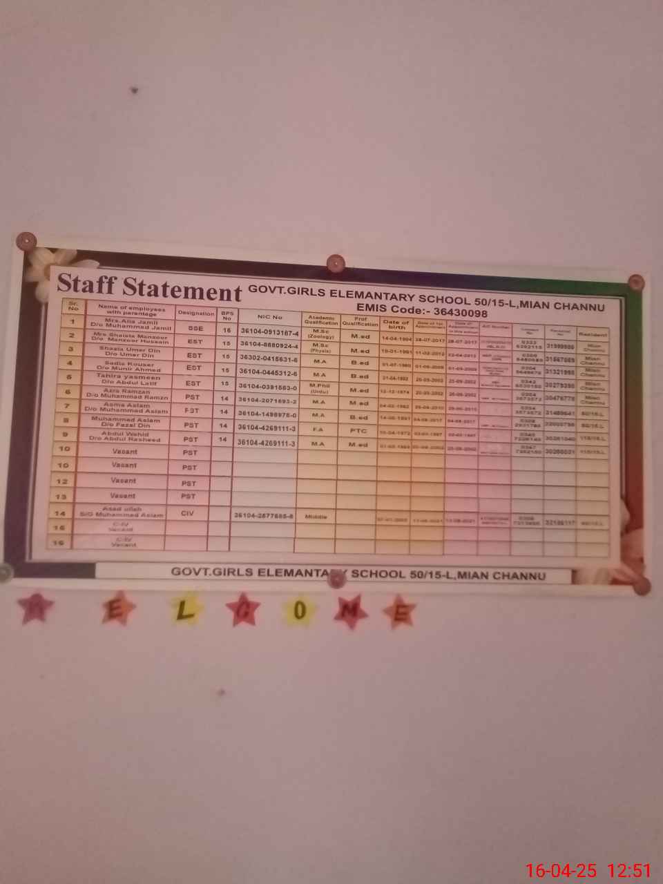 | EMIS Code: 36430098 | Name of School: GGES 50/15-L, MIAN CHANNU | |||