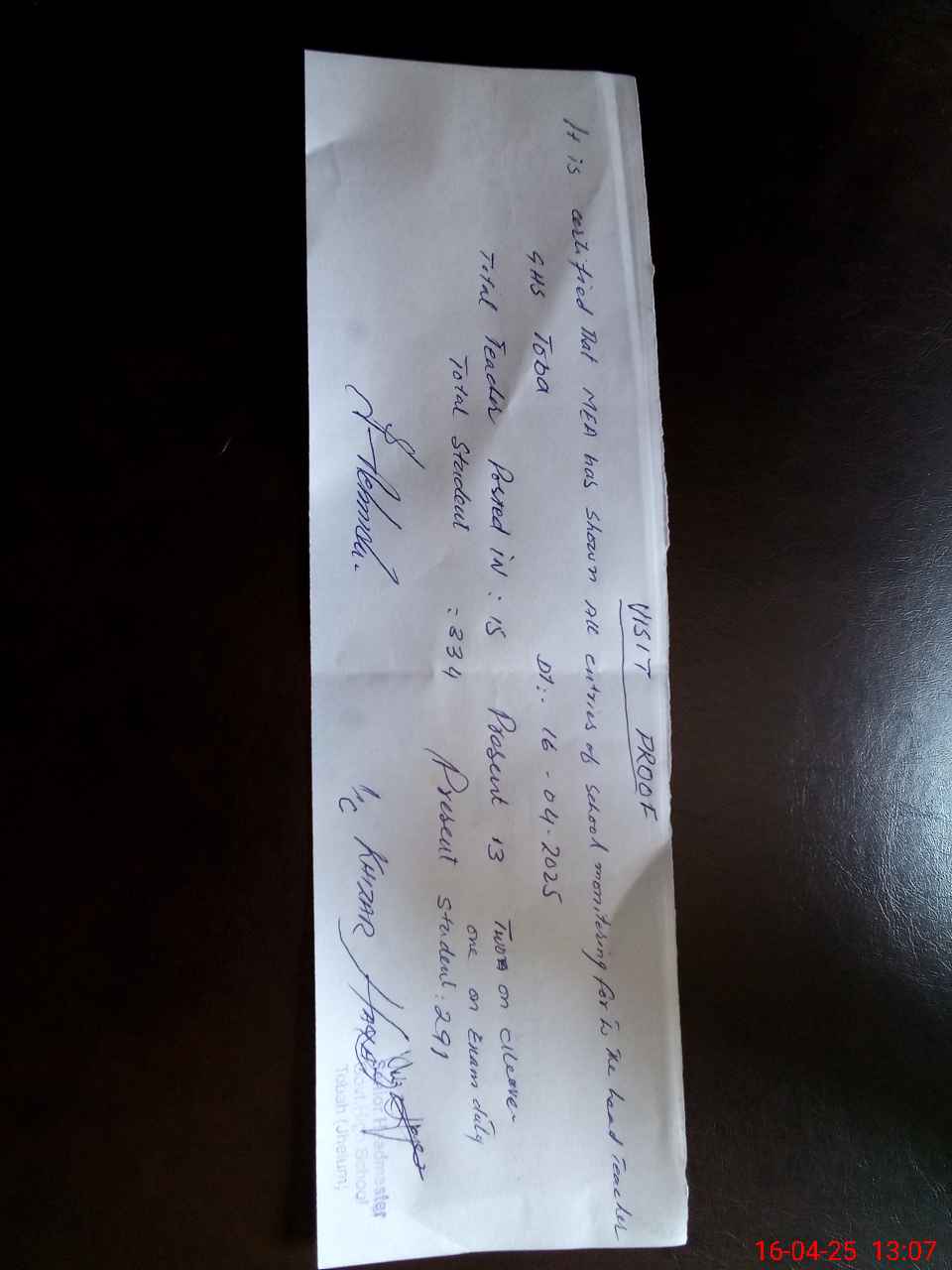 | Attendance Register | Head Teacher | MEA with School | Visit Proof |