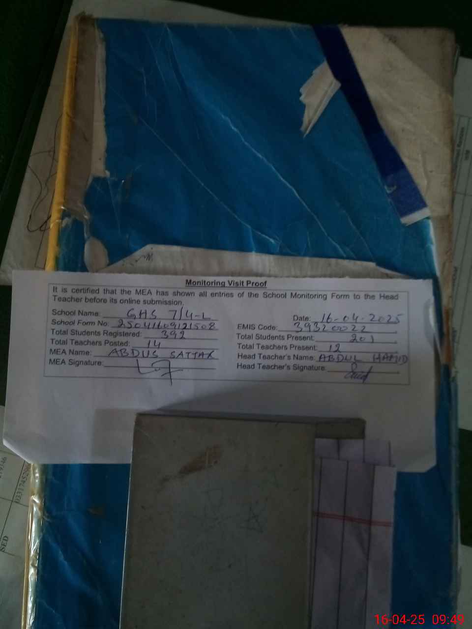 | Attendance Register | Head Teacher | MEA with School | Visit Proof |