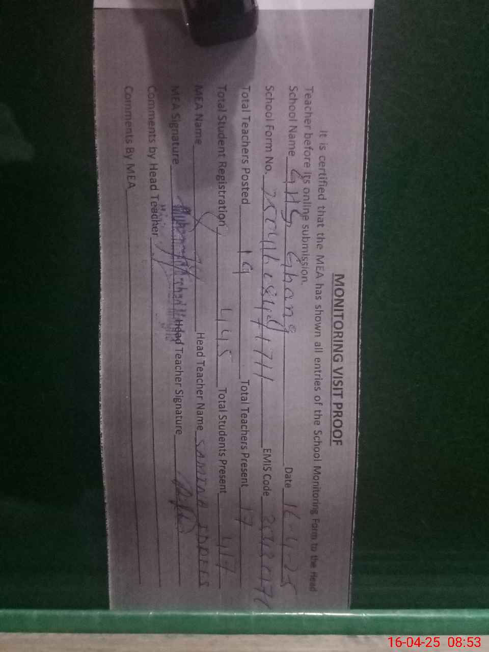 | Attendance Register | Head Teacher | MEA with School | Visit Proof |