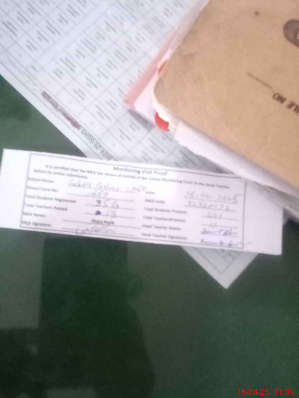 | Attendance Register | Head Teacher | MEA with School | Visit Proof |