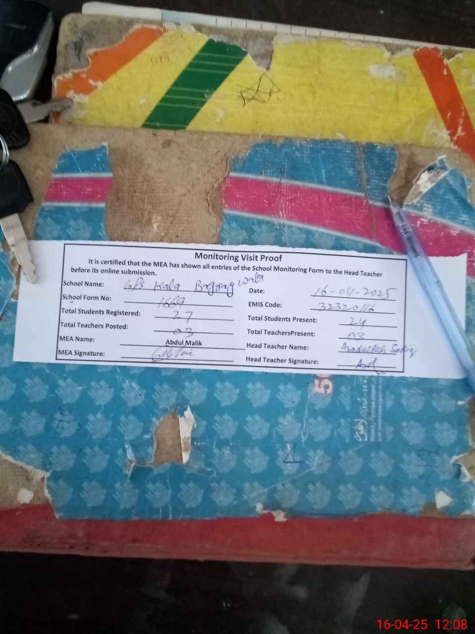| Attendance Register | Head Teacher | MEA with School | Visit Proof |