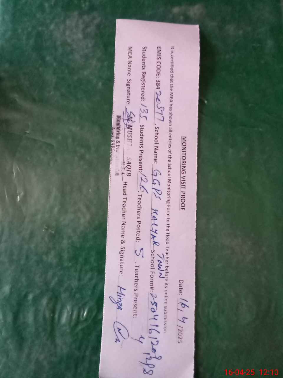 | Attendance Register | Head Teacher | MEA with School | Visit Proof |