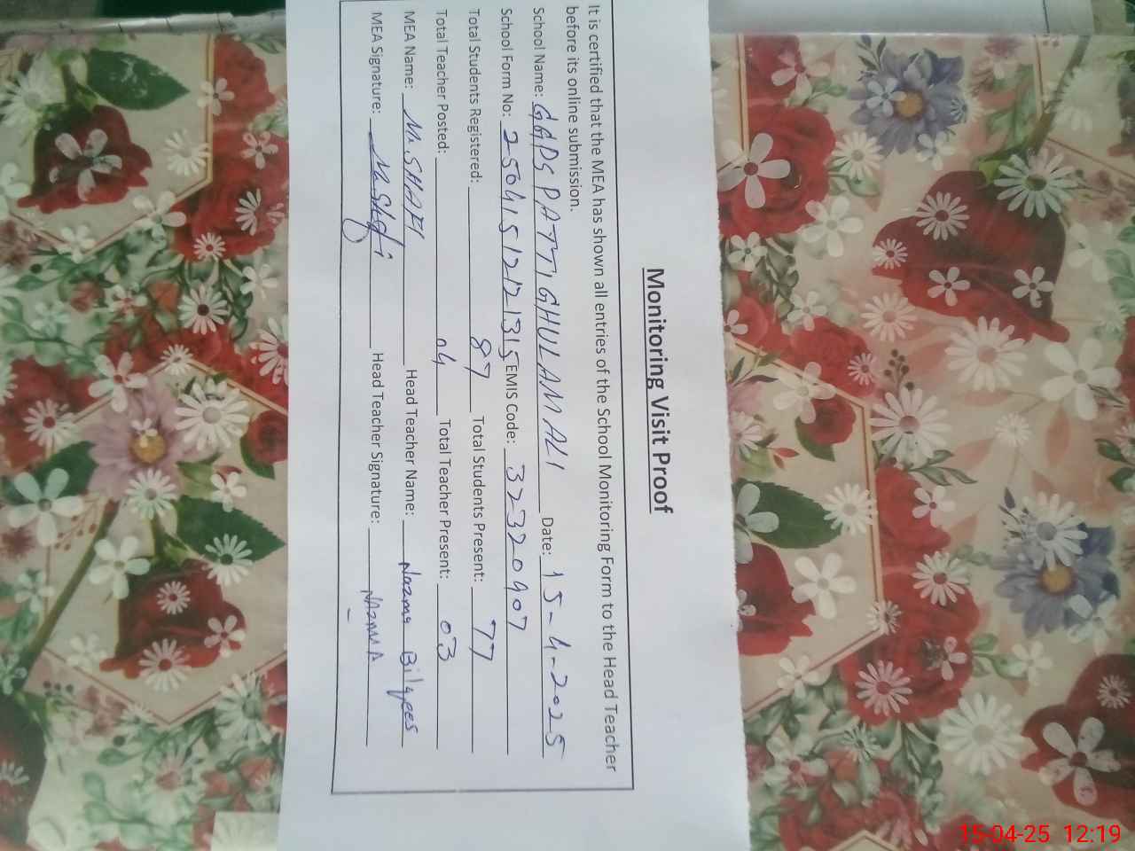 | Attendance Register | Head Teacher | MEA with School | Visit Proof |