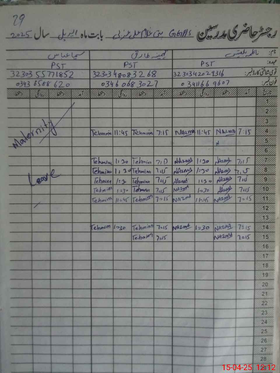 | CNIC | Full Name | Designation | R/C | Absence During Last Calender Month |