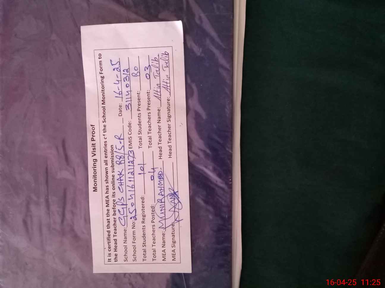 | Attendance Register | Head Teacher | MEA with School | Visit Proof |