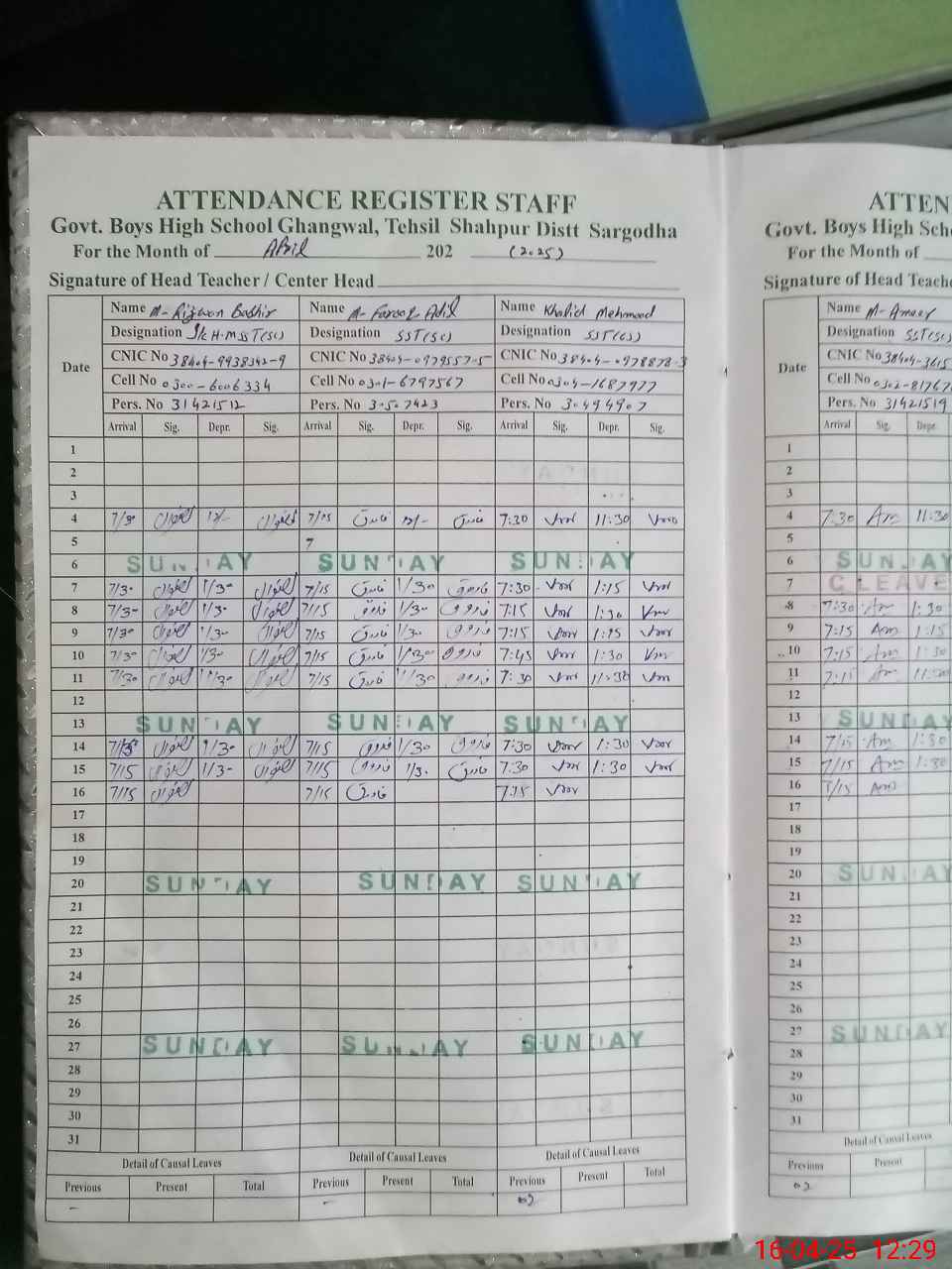 | CNIC | Full Name | Designation | R/C | Absence during last cal. month |