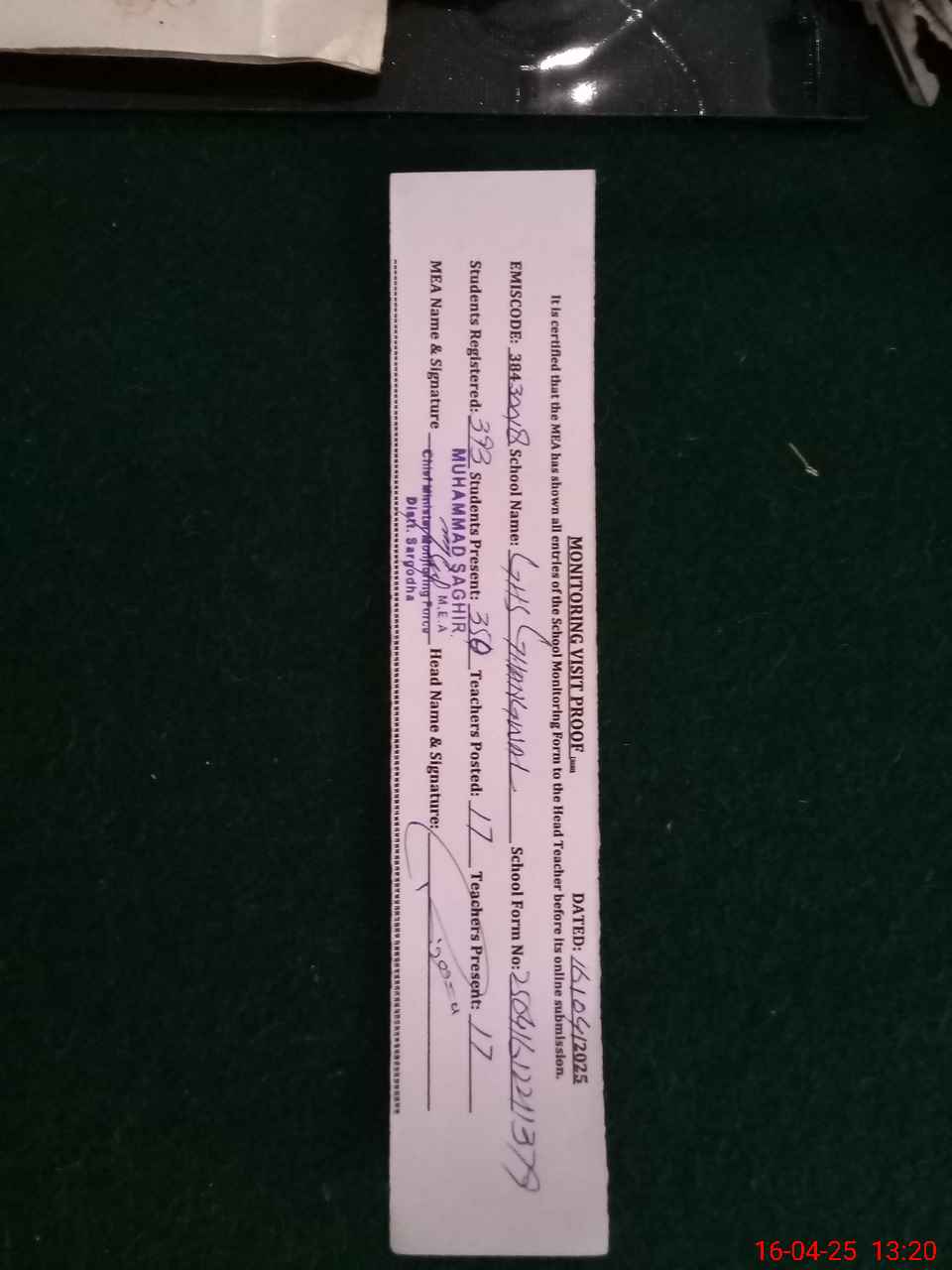 | Attendance Register | Head Teacher | MEA with School | Visit Proof |