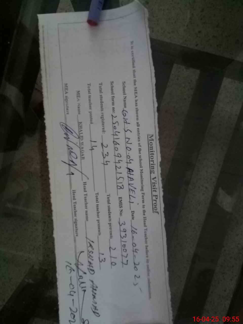 | Monitoring Date: 16-04-2025 | Start Time: 16-04-2025 09:28 AM | End Time: 16-04-2025 09:55 AM | Name of MEA: KH**** WA**** | |