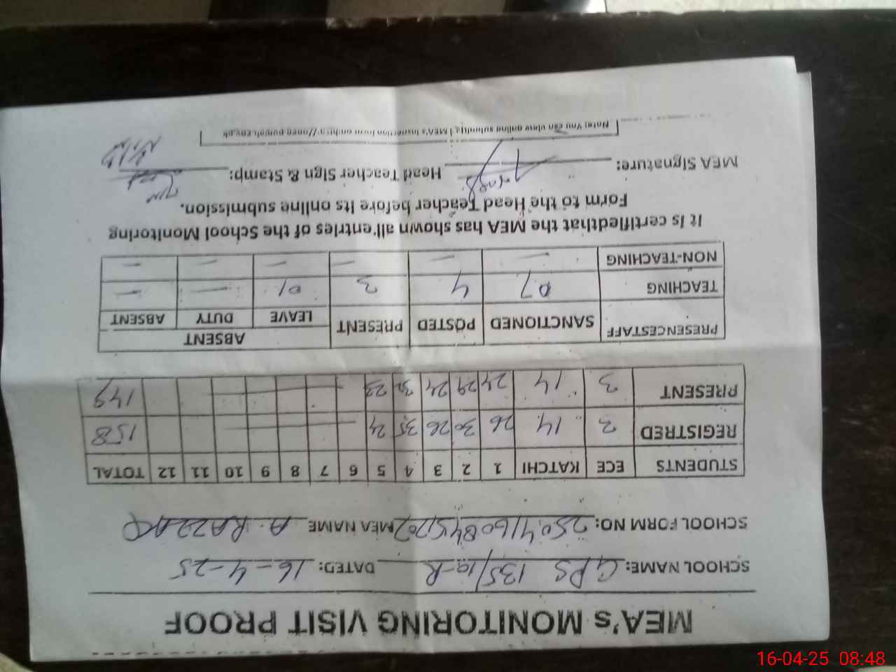 | Attendance Register | Head Teacher | MEA with School | Visit Proof |