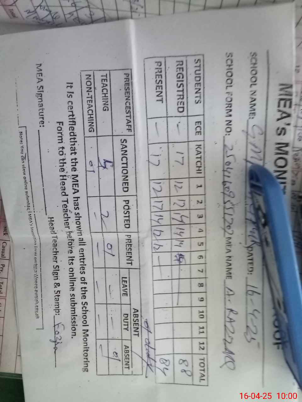 | Attendance Register | Head Teacher | MEA with School | Visit Proof |