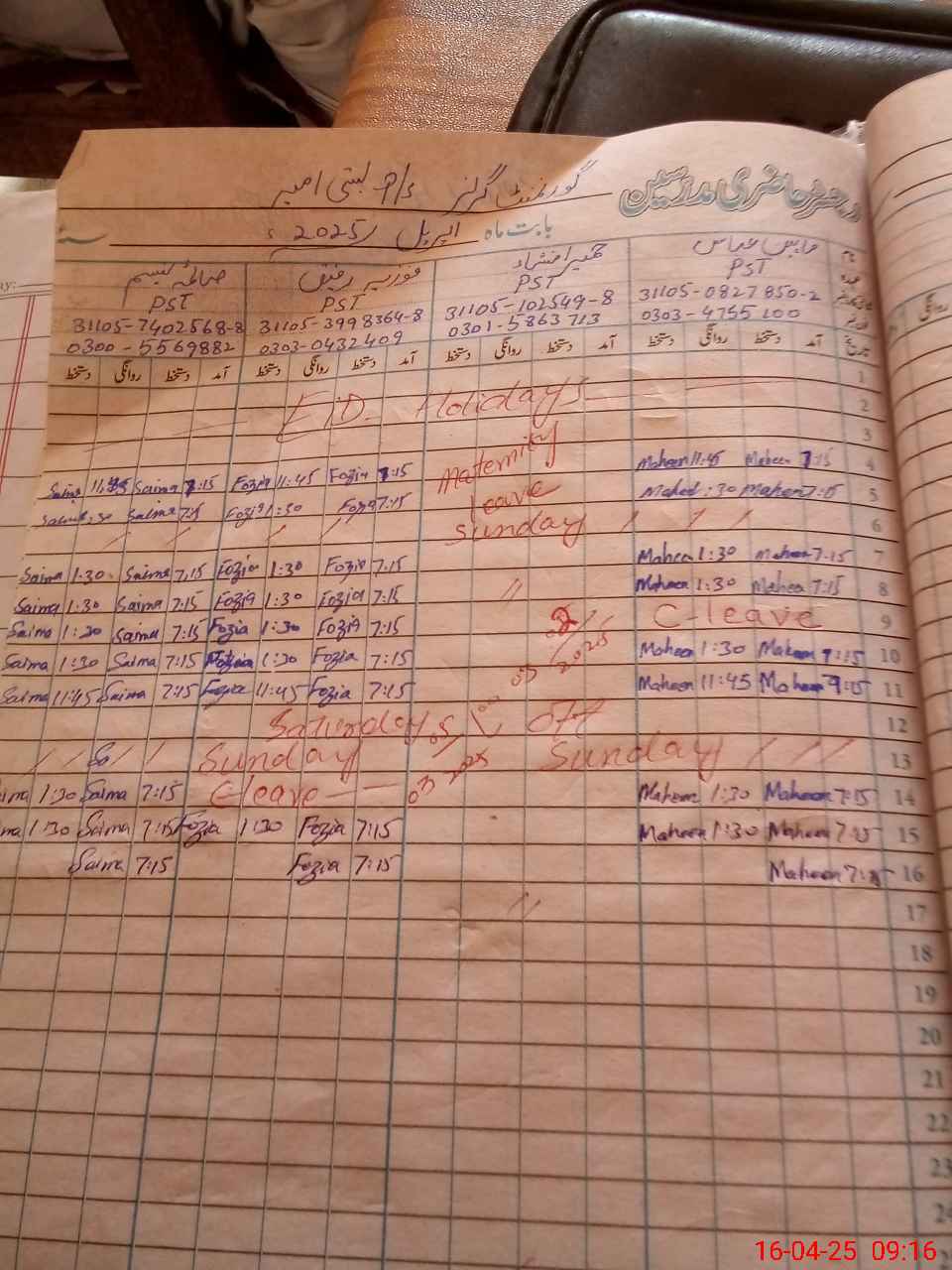 | Leave | Duty | Absent | Maternity | Medical | Ex- Pak |