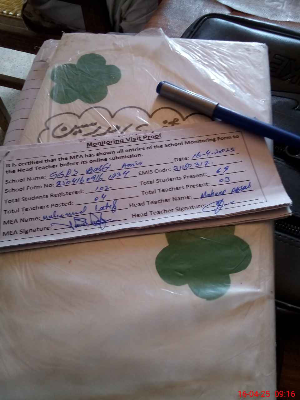 | Attendance Register | Head Teacher | MEA with School | Visit Proof |