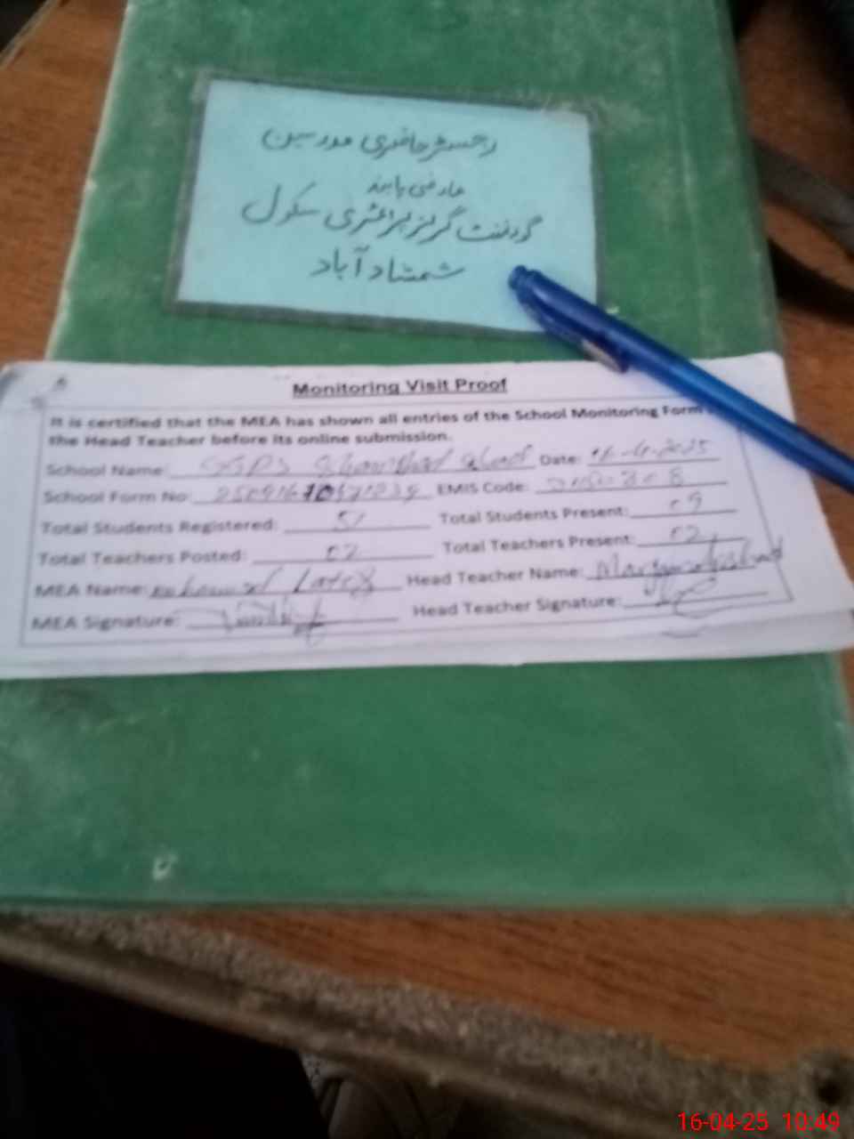 | Remarks (Use Separate Page if Required): There are no student attendance register in the school during the mea visit Students enrolled str wrote as per roznamcha | |||||