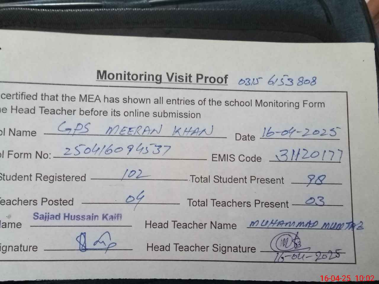 | Attendance Register | Head Teacher | MEA with School | Visit Proof |