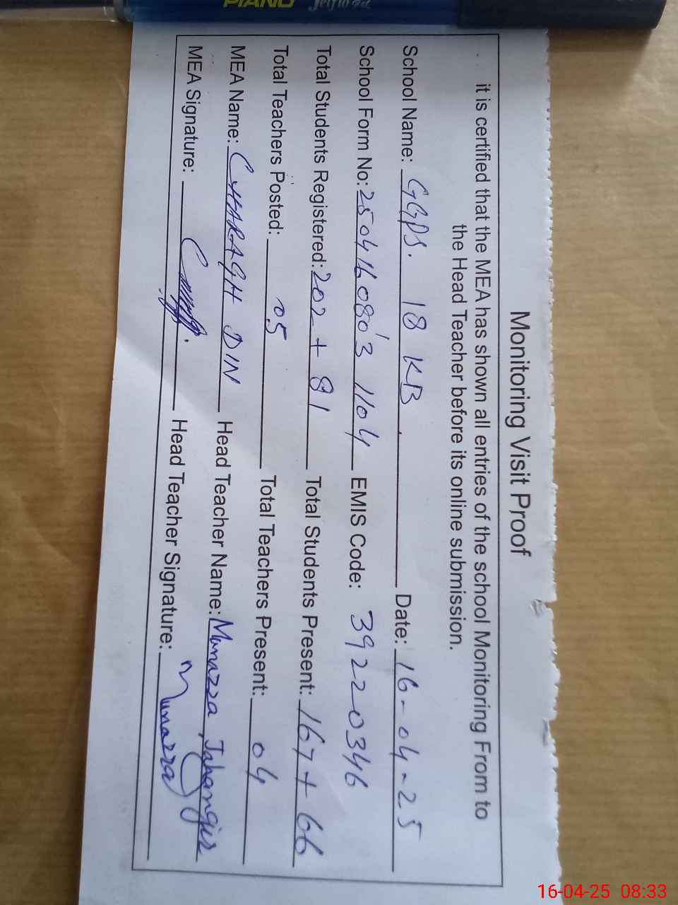 | EMIS Code: 39220346 | Name of School: GGPS 18 KB | |||
