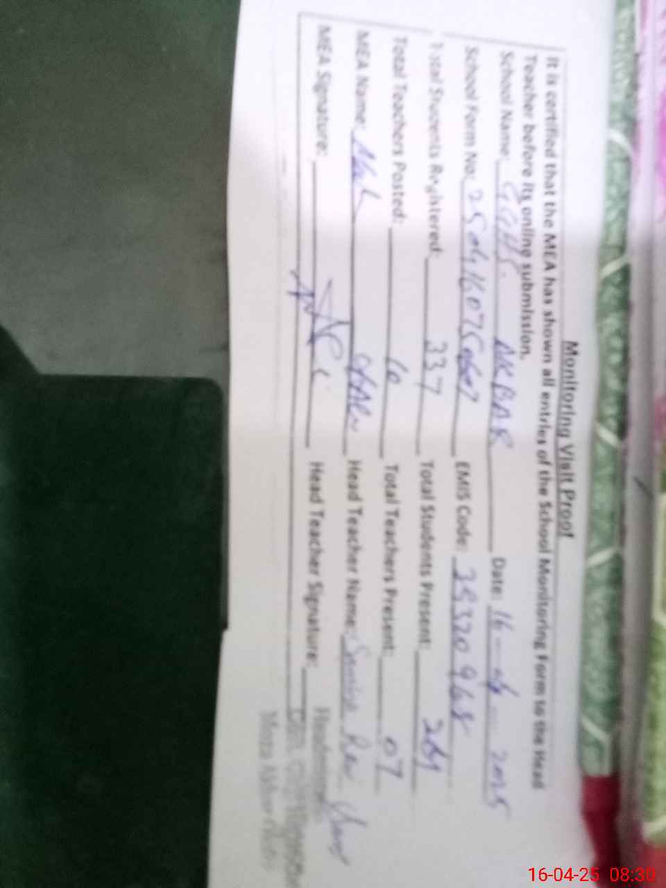 | Attendance Register | Head Teacher | MEA with School | Visit Proof |