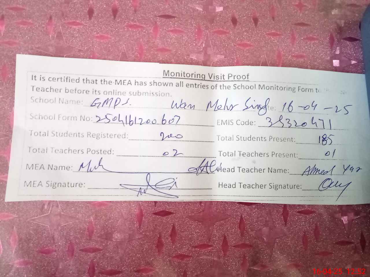 | Attendance Register | Head Teacher | MEA with School | Visit Proof |